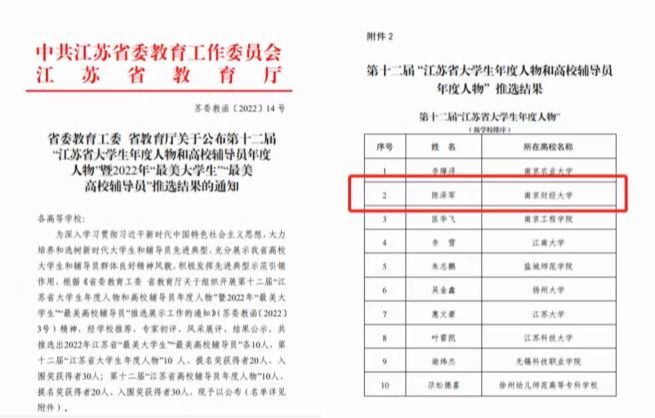 据悉,此次评选活动自启动以来,吸引了全省141所高校的大学生代表参赛,经学校推荐、材料审核、专家初评和线上风采展评,最终遴选出2022年江苏省“最美大学生”“江苏省大学生年度人物”各10人。