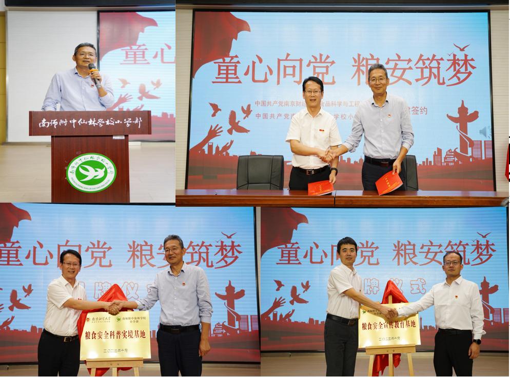 为了进一步健全完善粮食安全宣传教育长效机制,实现党组织优势互补作用,10月18日上午,我院与南京师范大学附属中学仙林学校小学部举行党建共建签约仪式。
