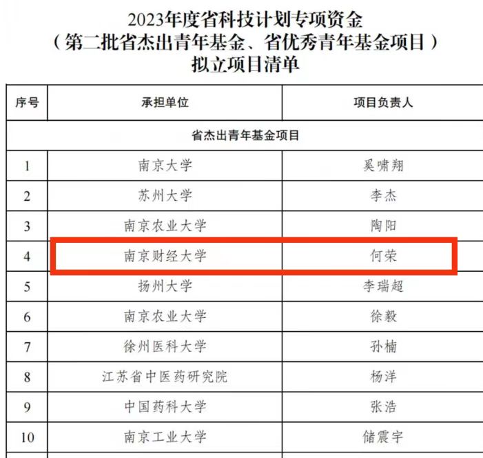 近日,江苏省科学技术厅下达了 “2023年度省科技计划专项资金(第二批省杰出青年基金、省优秀青年基金项目)立项的通知”,我院何荣副教授获批江苏省省杰出青年基金项目。