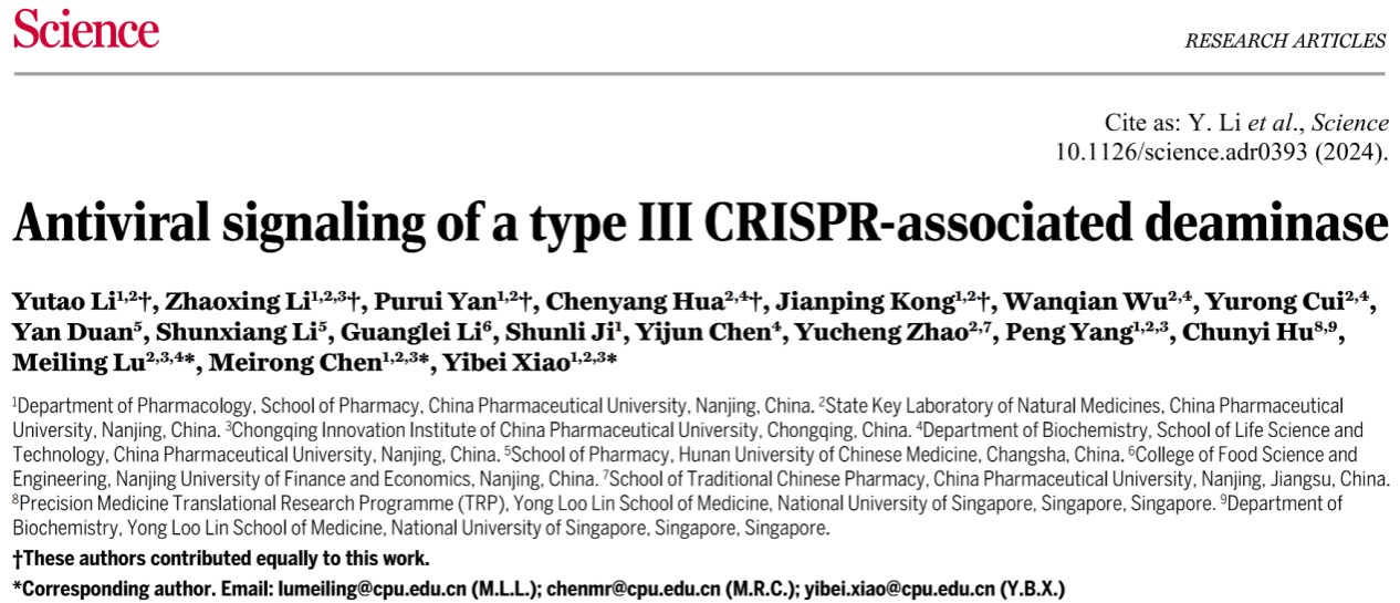 近日,我院青年教师李光磊参与中国药科大学肖易倍教授团队牵头的CRISPR-Cas调控ATP消耗抗病毒机制研究,在国际顶级期刊Science上发表了题为Antiviral signaling of a type III CRISPR-associated deaminase的研究论文,必发集团welcome欢迎光临为论文合作单位。