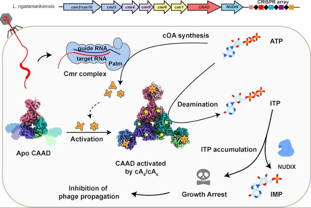 该研究报道了III型CRISPR cas调控的ATP耗竭的抗病毒机制,其中CRISPR-cas相关的腺苷脱氨酶(CAAD)在被cA4或cA6激活后将ATP转化为ITP,通过耗竭ATP导致细胞生长停滞从而抑制病毒扩散。在消除感染后,Nudix水解酶将ITP水解为无毒的IMP使细菌恢复生长。结合冷冻电镜结构和生化证据,研究阐明了CRISPR-CAAD系统耗竭ATP实现免疫的分子机制。我校李光磊博士对本研究的CAAD脱氨酶活性的鉴定提供了重要支持。