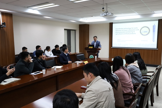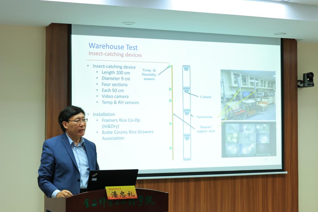 潘忠礼教授围绕农产品和食品中储粮害虫的早期检测和环境监测问题,系统分析了储粮害虫在不同环境下的发生发展规律,详细介绍了团队在粮食储藏过程中的储粮害虫的预警监测仪器设备的研发,并向大家展示了其研究成果在食品及农产品加工产业化方面的应用。