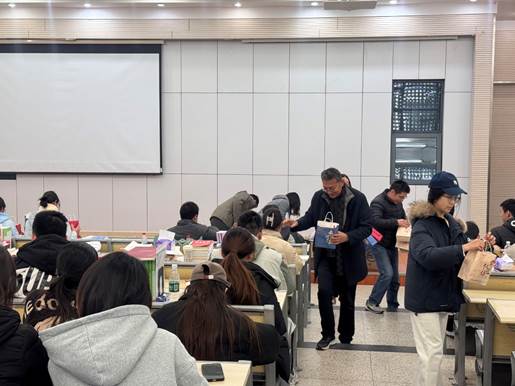 在温馨融洽的氛围中,学院领导与老师们亲手将一份份精心准备的“考研加油包”送到学生手中。每份加油包内不仅有实用的学习文具、缓解疲劳的睡眠眼罩等物资,还附有学弟学妹们亲手写下的祝福贺卡。字里行间承载着真挚的鼓励与美好的期盼,成为这个冬日里一份特别的精神助力。