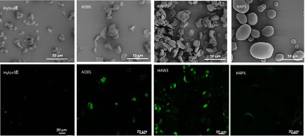 图3 不同HAS颗粒的SEM图像(灰色)与FITC标记GA的CLSM图像(绿色)