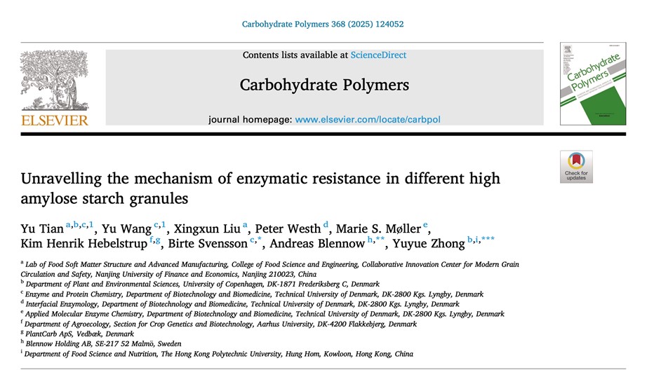 2025年11月15日,7790必发集团田雨(第一作者),联合丹麦技术大学、哥本哈根大学、香港理工大学等多个国际团队,在国际TOP期刊 Carbohydrate Polymers(Q1,IF: 12.5)发表题为 “Unravelling the mechanism of enzymatic resistance in different high amylose starch granules”的研究性论文。