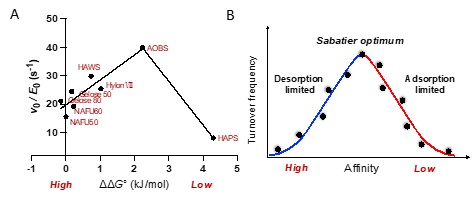 本研究选取来源于玉米、大麦、小麦和马铃薯的8种高直链淀粉,以葡萄糖淀粉酶(GA)为模型酶,创新性地应用界面酶动力学方法,系统解析了酶在淀粉颗粒界面的作用行为。通过定量表征酶的结合位点密度、催化位点密度、催化周转率及酶-底物亲和力,并结合FTIR-ATR、扫描电子显微镜(SEM)、共聚焦激光扫描显微镜(CLSM)及表面链长分布分析,建立了颗粒表面结构与界面催化动力学之间的关联。研究表明,高直链淀粉的酶解抗性主要来源于催化位点密度的降低,而非传统认知中的物理可及性限制。进一步分析发现,不同HAS之间抗性差异的本质在于酶-底物亲和力对催化周转率的调控作用。本研究首次将Sabatier原理引入淀粉颗粒界面催化体系,揭示酶活性与亲和力之间呈“火山型关系”:适中的酶-底物相互作用可实现最优催化效率,而过强或过弱的结合均会抑制反应进行。