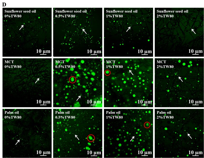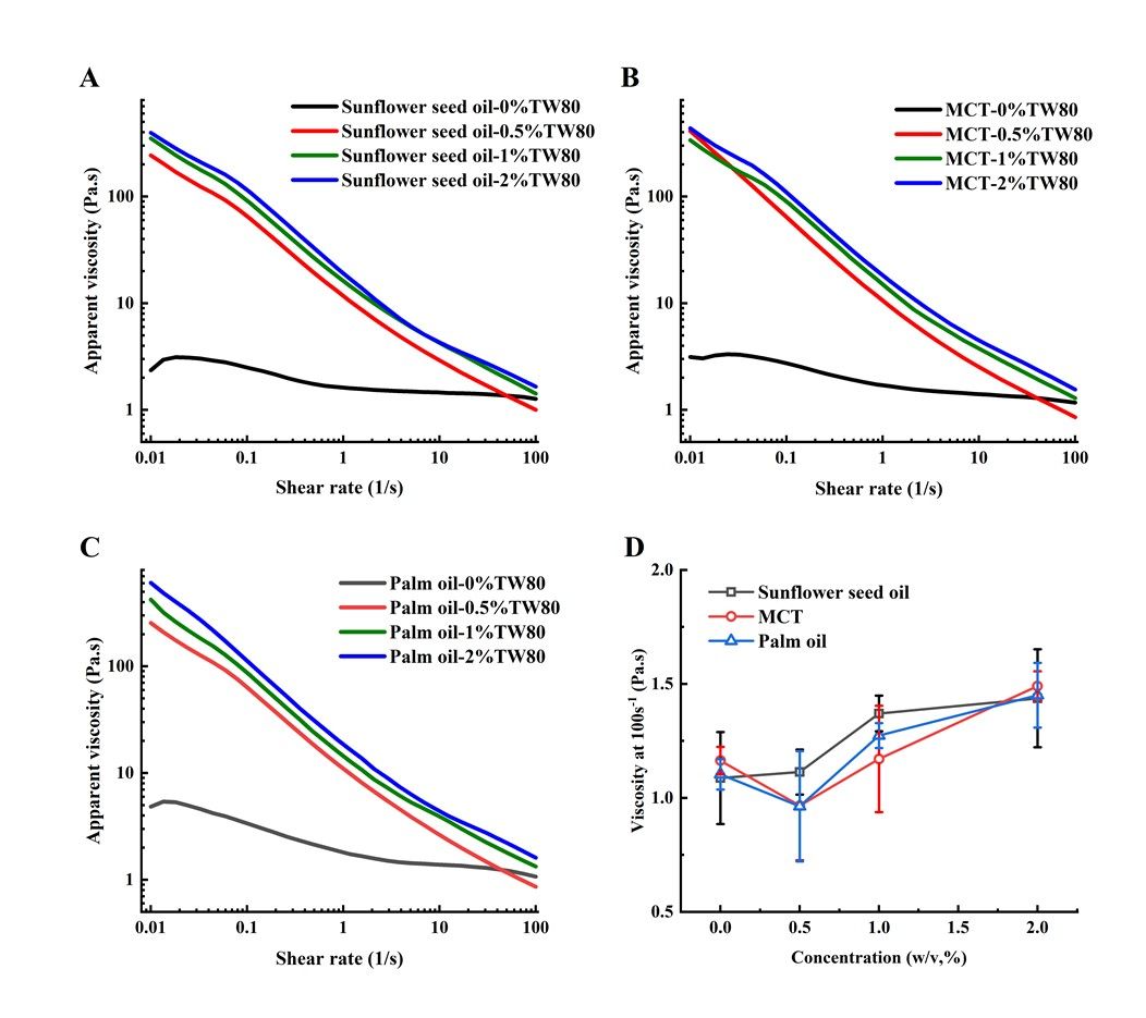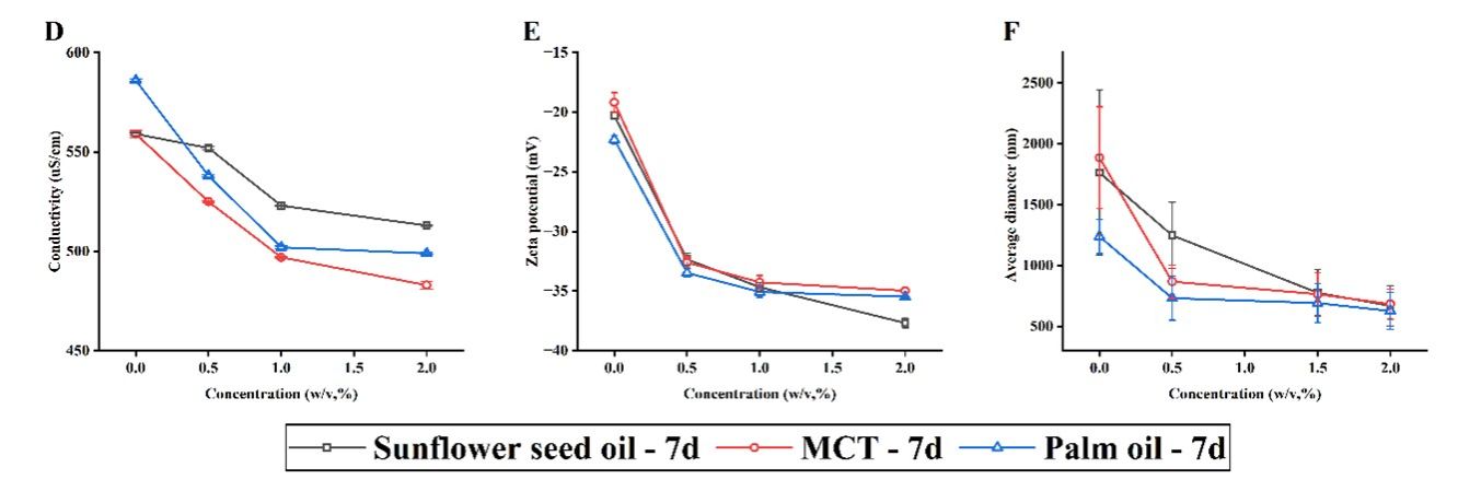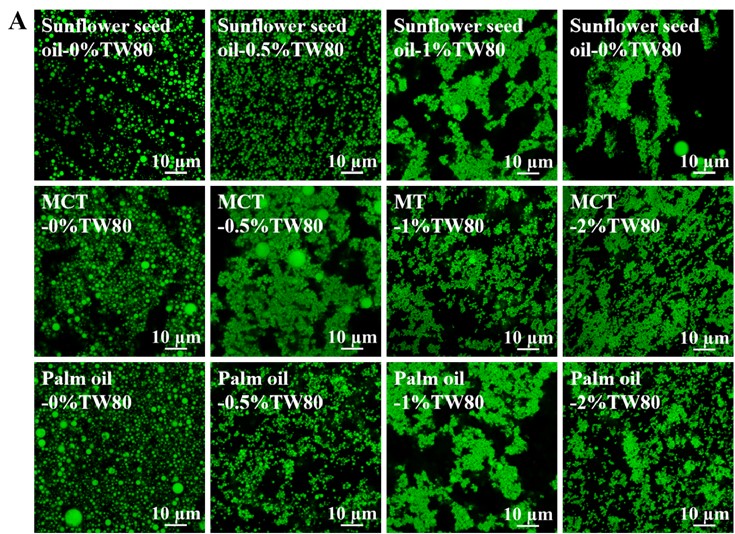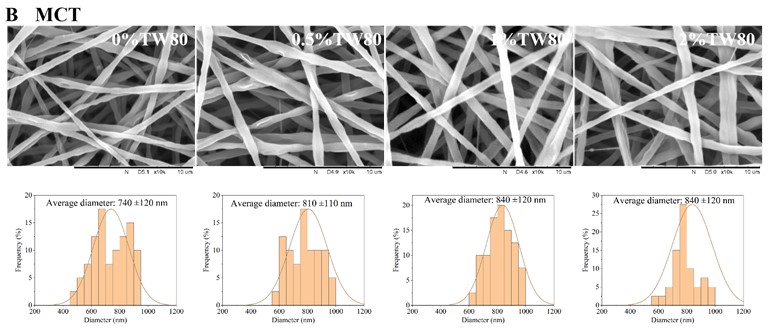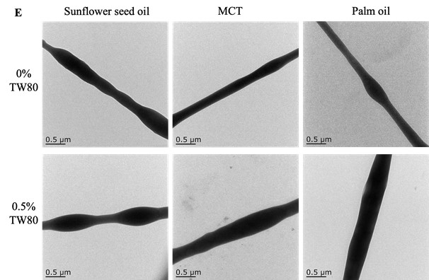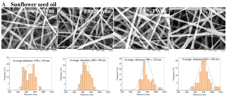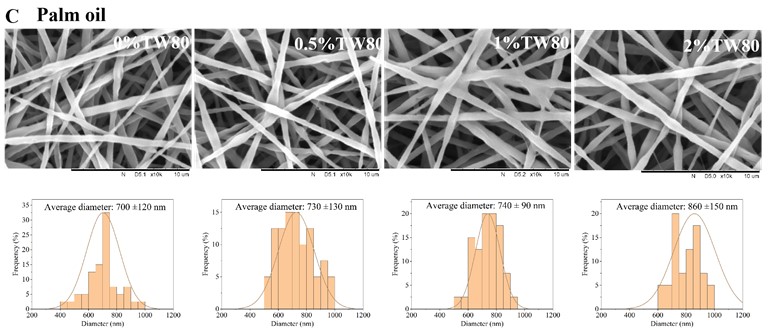 本研究以OSA改性淀粉-普鲁兰多糖复合体系为基础,选取了三种具有不同脂肪酸组成的食用油(向日葵油、中链甘油三酯MCT和棕榈油),结合不同浓度的Tween 80,系统制备了OSA淀粉基乳液并进行静电纺丝。研究从乳液稳定性、表观黏度、界面张力、电导率、Zeta电位和液滴粒径等多个维度对乳液性质进行了全面表征,并通过SEM、CLSM、TEM和FTIR等手段对纳米纤维的形貌、内部结构及化学组成进行深入分析,同时定量评价了不同体系纤维的载油量,系统揭示了油脂类型与表面活性剂浓度对乳液行为和纤维成形的协同调控机制。