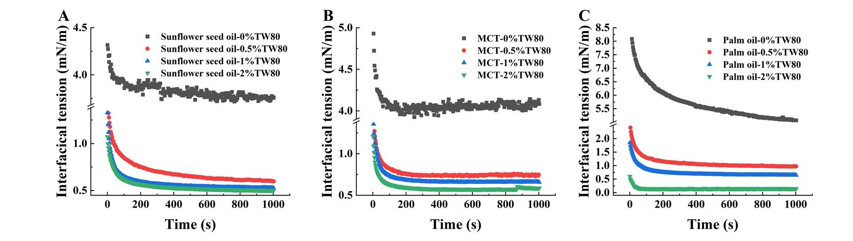 图5 不同油脂类型及Tween 80浓度对OSA淀粉基乳液界面张力的影响