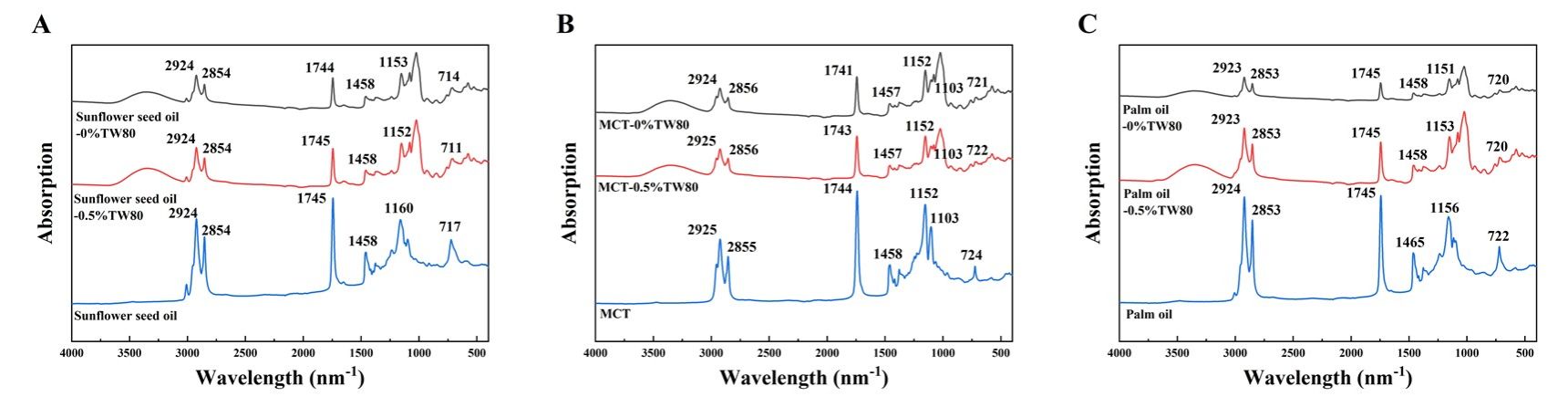 图8 不同油脂类型及Tween 80浓度下电纺OSA淀粉基乳液纳米纤维的FTIR光谱