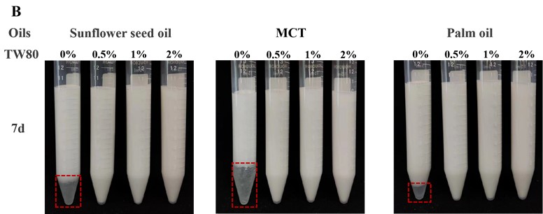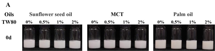 图2 不同油脂类型及Tween 80浓度下OSA淀粉基乳液的外观及稳定性