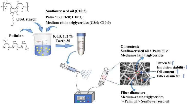 图1油脂类型与Tween 80对OSA淀粉基乳液静电纺丝协同调控示意图