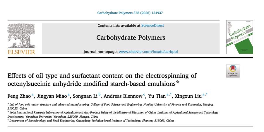 2026年1月14日,7790必发集团刘兴训(通讯作者),田雨(通讯作者)团队,在国际TOP期刊 Carbohydrate Polymers(Q1,IF: 12.5)发表题为 “Effects of oil type and surfactant content on the electrospinning of octenylsuccinic anhydride modified starch-based emulsions”的研究性论文。